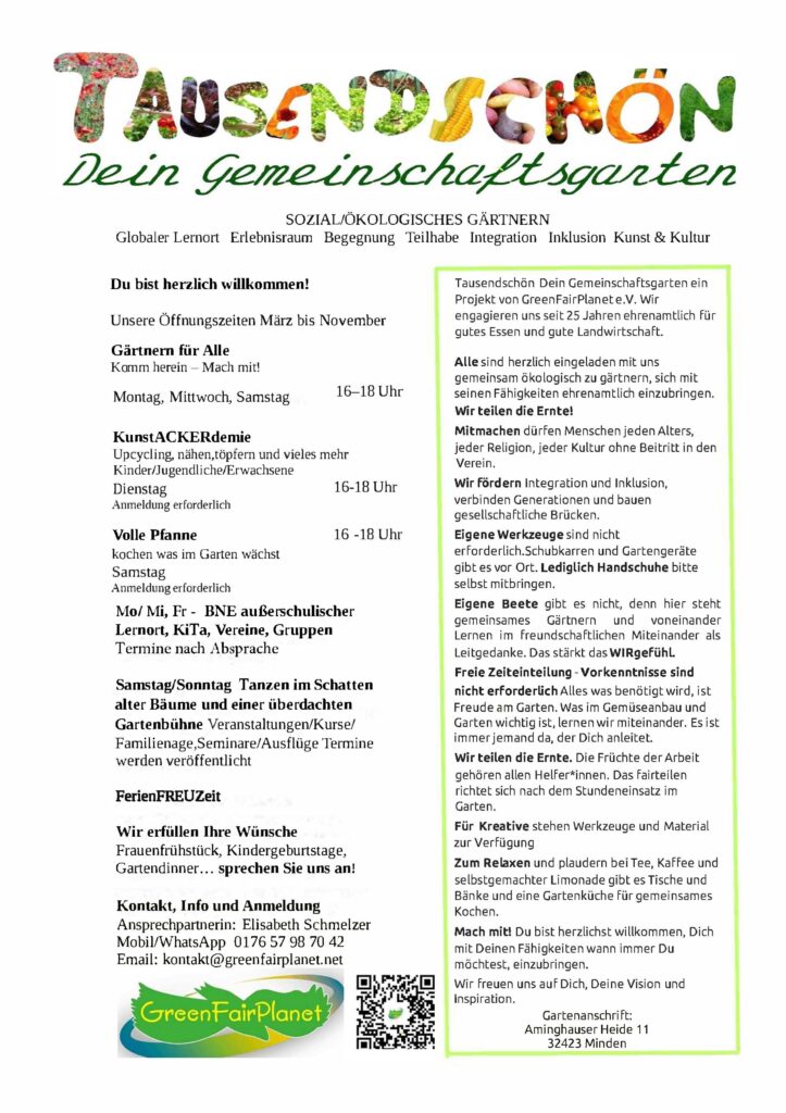 Einladung zum Infonachmittag Gemeinsam gärtnern. Ziel ist es, das generationen- kulturübergreifende Zusammenleben durch das gemeinsame Pflanzen, Ernten und den gemeinsamen Austausch im Tausendschön und das ehrenamtliches Engagement zu fördern;