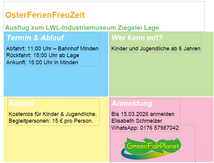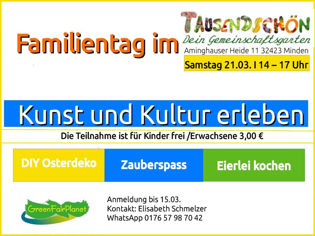 Familientage sind Mitmachaktionen mit einem kreativen Begleitprogramm und kulinarischen Genuss. Eingeladen sind alle. Eintritt und gemeinsam gekochte Suppe frei!! ANMELDUNG ERFORDERLICH! Mobil/WhatsApp 0176 57 98 70 42 oder info@greenfairplanet.net Familientag Samstag 20.04.2024 Bio Pflanzkartoffeln für jeden Geschmack Unsere Kartoffelvielfalt im Tausendschön: Belinda, Blauer Schwede, Heiderot,…